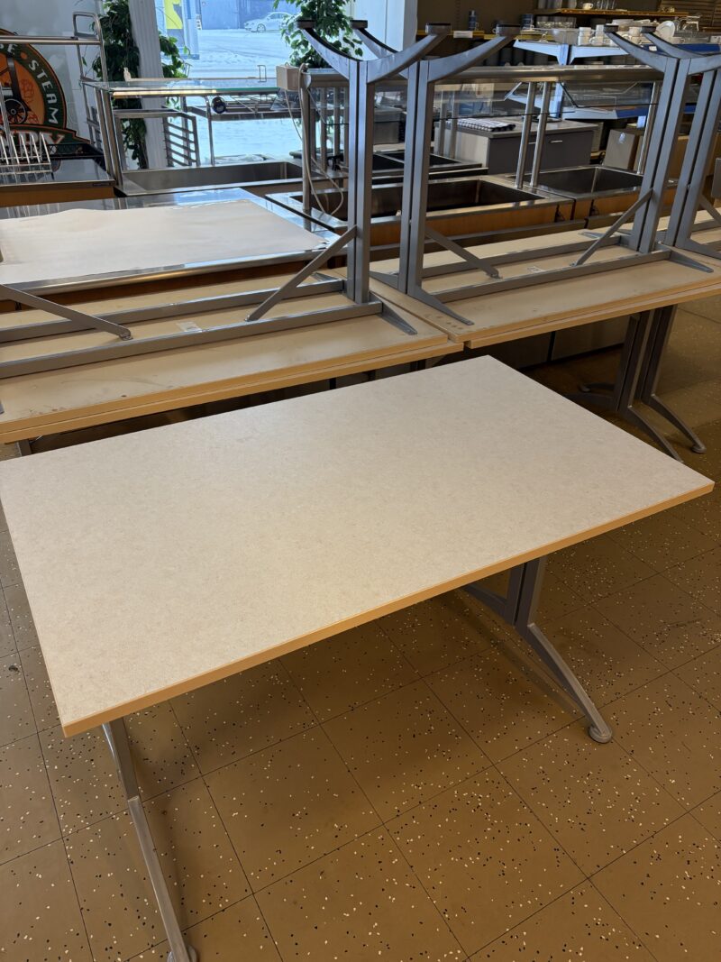- Vaalea pöytäpinta puureunuksella ja harmailla jaloilla.